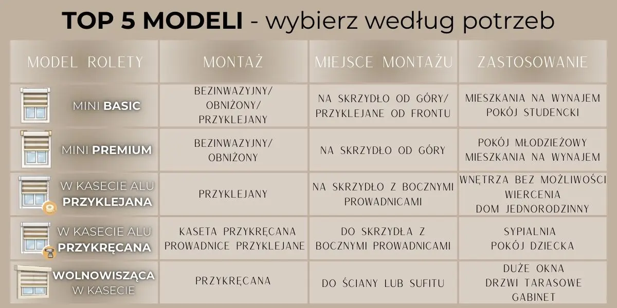 Każdy z nich odpowiada na inną potrzebę. Od montażu bez wiercenia i kasety aluminiowej, po osłony na duże okna, wnęki oraz okna balkonowe. Uwzględniliśmy też modele dla osób, które szukają minimalistycznego wyglądu.