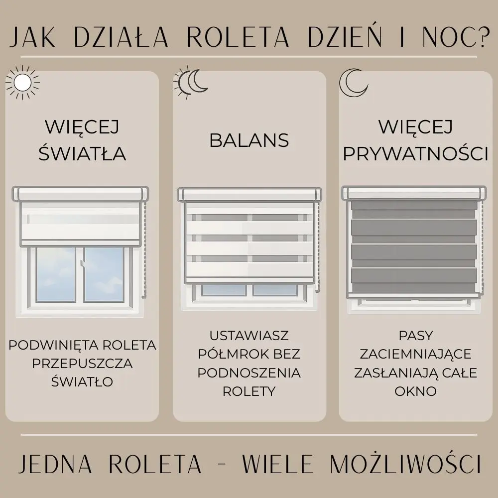 Dla kogo: dla osób, które chcą rolety dzień i noc w dobrej cenie, z prostą obsługą i szybkim montażem na skrzydle okna.