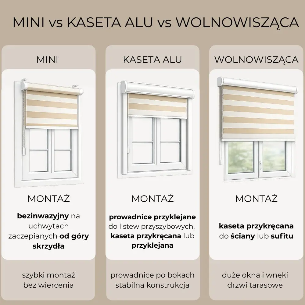 MINI to lekka forma na skrzydło i montaż bez wiercenia. Kaseta ALU to bardziej „zabudowany” wygląd na oknie (kaseta + prowadnice). Wybór zależy od tego, czy ważniejszy jest montaż bezinwazyjny i prostota (MINI), czy wykończenie kasetą (ALU).
