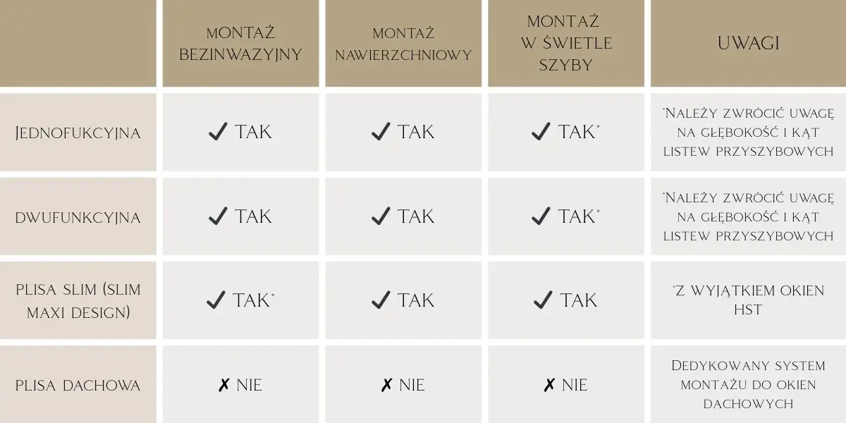 Zastanawiasz się, jaki montaż można zastosować do danej plisy? Poniższa tabela pokazuje, które rodzaje montażu plis pasują do konkretnych typów plis – dzięki temu szybko dobierzesz właściwe rozwiązanie do swojego okna.