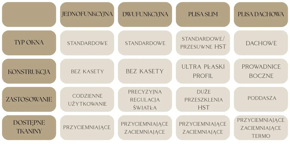 Poniższa tabela pomoże dobrać plisy okienne do rodzaju okna. Sprawdzisz tu szybko, jaka konstrukcja plisy będzie odpowiednia, do jakiego zastosowania pasuje oraz jakie tkaniny do plis są dostępne w danym wariancie.