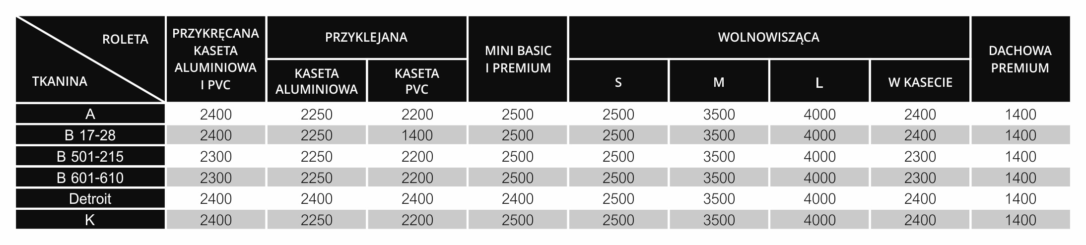 Przy większych wysokościach niż podanych w tabletce tkanina może nie zwinąć się całkowicie na wałek lub do kasety.