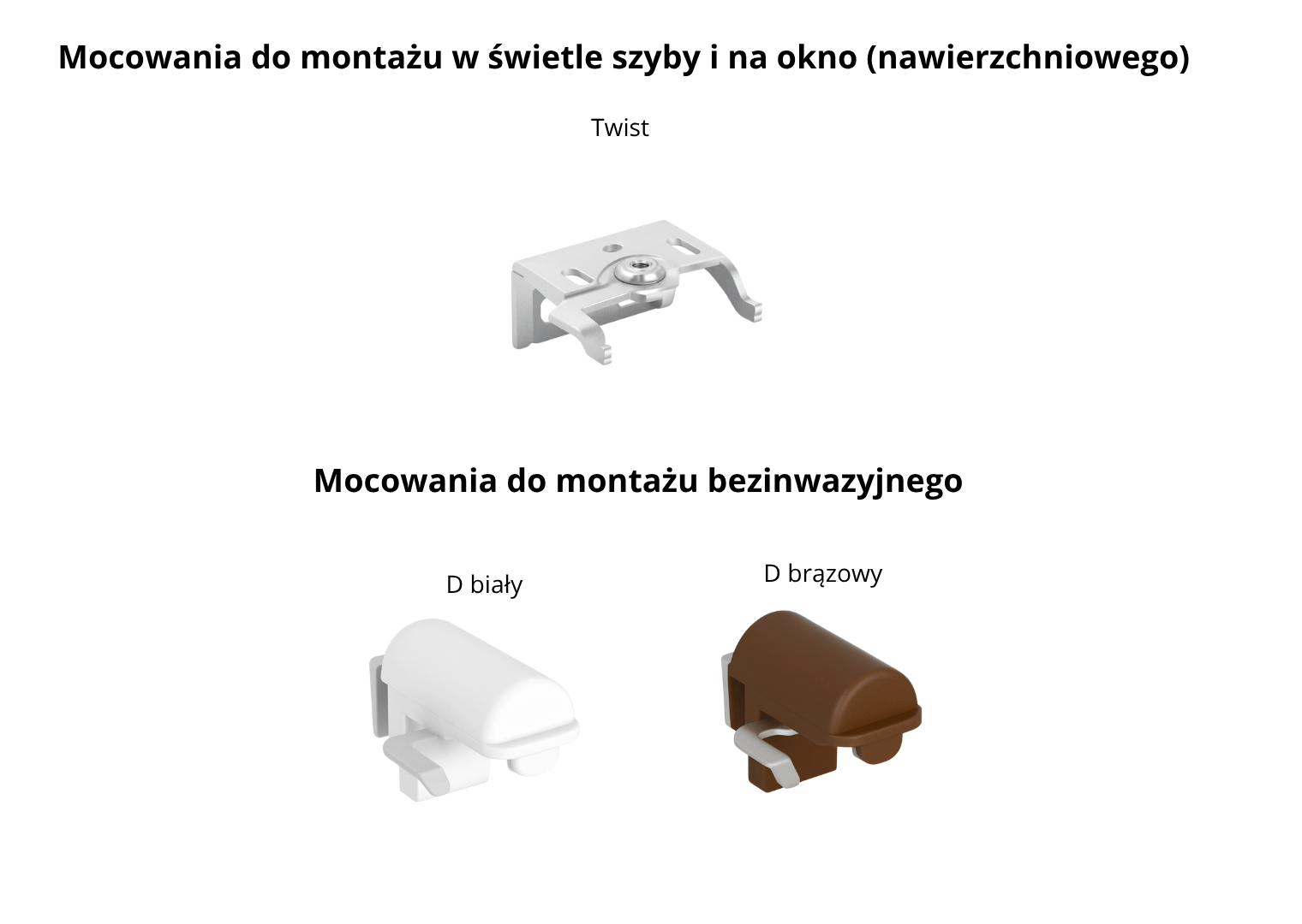 Solidny, metalowy uchwyt z systemem twist do montażu w świetle szyby lub nawierzchniowego. Dzięki minimalistycznej budowie pozostaje niemal niewidoczny. Polecany do wszystkich rodzajów żaluzji.