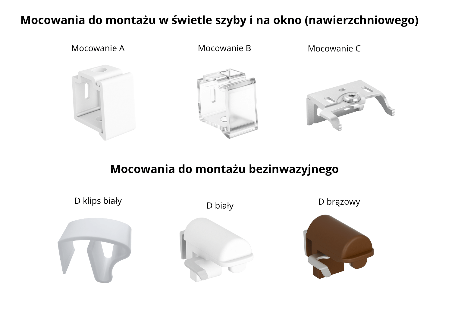Uniwersalne mocowanie do żaluzji montowanych nawierzchniowo lub w świetle szyby. Dzięki przezroczystemu wykończeniu pasuje do każdego koloru żaluzji – idealne do wnętrz z różnorodną kolorystyką.
